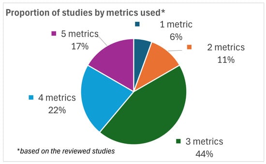 To better understand the frequency of usage of these metrics, we conducted a quantitative assessment based on the reviewed studies. Initially, we are reporting the metrics used per global product (see Table 6). In addition, the last column and row are highlighting the trends and preferences in selecting validation metrics. Notably, the majority of works rely on at least three or more validation metrics (Figure 3). In contrast, only one of the reviewed studies [] validated its results using a single indicator. To explain the interest in multiple validation metrics in the reviewed studies, we further explored the types of metrics implemented. The last row of Table 6 represents the number of times each metric was used across different studies. Overall, the trends suggest a shift away from relying solely on aggregated indices, such as overall accuracy or kappa.