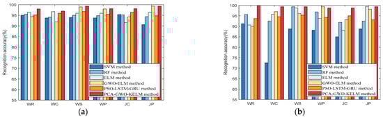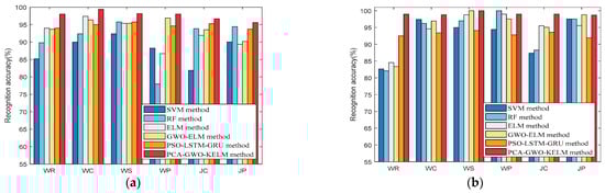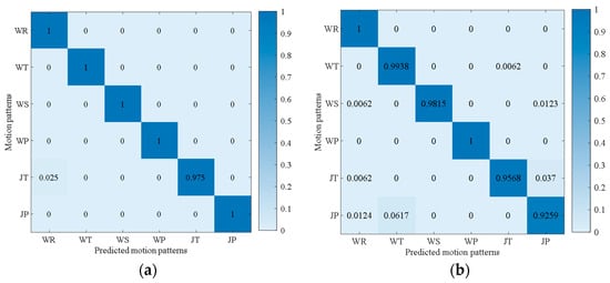 Figure 4 presents the accuracy of the proposed PCA-GWO-KELM model in multiple movement model recognition. Results have demonstrated that the accuracy of the motion pattern recognition for WR, WT, WS, WP, JT, and JP modes are, respectively, 100%, 100%, 100%, 100%, 97.50%, and 100% on the 24 m path. And the recognition rates for WR, WT, WS, WP, JT, and JP modes are, respectively, 100%, 99.38%, 98.15%, 100%, 95.68%, and 92.60% on the 97.2 m path. The PCA-GWO-KELM model achieves a high recognition rate of motion pattern under different scenes.