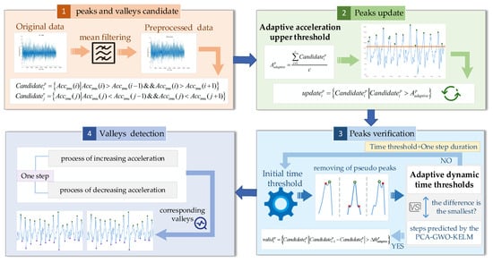 Figure 5. The proposed gait detection method includes peak and valley candidates, peak update, peak verification, and valley detection.