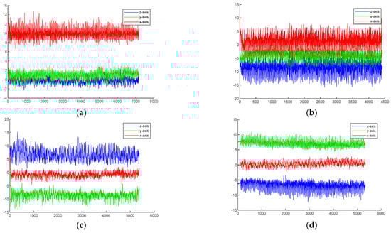 Figure 6 shows the changes in motion acceleration in reading, phone, swing, and pocket modes. The red line represents the