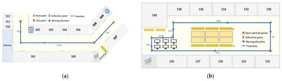 To validate the recognition accuracy of the proposed PCA-GWO-KELM model, experiments have been carried out in two separate experimental paths with six different motion modes, including walking and reading (WR), walking and telephoning (WT), walking and swinging (WS), walking and pocketing (WP), jogging and telephoning (JT), and jogging and pocketing (JP). WR mode refers to when a pedestrian is walking at normal speed with their phone steadily placed in front of their chest. WT mode refers to the situation where a pedestrian is walking at normal speed with their phone held to their ear to answer a call. WS mode refers to the state where a pedestrian’s phone swings at random while walking at normal speed. WP mode refers to the situation where pedestrians place their mobile phones in the side pockets of their pants while walking at normal speed. JT mode refers to the situation where a pedestrian answers a call with their phone held to their ear while running. JP mode refers to the situation where a pedestrian’s phone is placed in the side pocket of their pants while running. The device used in this experiment is Mate60 Pro cell phone. These two planned experimental paths are two indoor straight corridors with a building length of 24 m and 97.2 m, respectively.