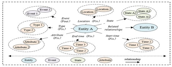 (1) Temporal knowledge graph. It focuses on adding timestamps or time intervals to annotate entities and state changes in the knowledge graph. When time dependency exists, the state and characteristics of entities at various times can be easily determined []. For example, Tanon et al. [] developed the Yet Another Great Ontology (YAGO) model, which incorporates a temporal dimension into entity attributes by adding start and end times to indicate the validity of those attributes within a specific time range. However, the YAGO model has limitations in addressing complex temporal interactions and characterizing entity changes, providing only basic temporal information. Related organizations [,] developed a semantic knowledge base DBpedia based on Wikipedia, which captures relevant information about objects at specific times, tracks changes in knowledge over time, analyzes dynamic changes and development trends []. The geographic knowledge representation model (GeoKG) by Zhang et al. [] comprises the following six interrelated components: location, time, attributes, state, change, and relationship. By incorporating specific temporal information and the overall characteristics of different states, the model effectively captures the states of geographic entities at various times and their temporal changes []. He et al. [] proposed a geo-scene knowledge representation framework for expressing the representation and intrinsic relationships of geographic scenes. Mao et al. [] proposed a spatiotemporal process-based conceptual model of urban waterlogging emergency ontology and explored the construction of its knowledge graph through key technologies like knowledge extraction, fusion, and storage. Zhu et al. [] proposed a GKG adaptive representation model that considers complex spatiotemporal features and relationships. This model adaptively represents geological knowledge based on the spatiotemporal correlation of different types of geological knowledge under the constraint of a unified spatiotemporal ontology. The spatiotemporal knowledge graph is effective for recording and describing the temporal correlation in between and simple spatiotemporal information about geographic entities. However, it has certain limitations in capturing changes in entities and their causal relationships, which limits in-depth research on geographic spatiotemporal processes [].