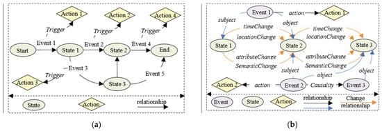 where is an entity object’s state at a specific point in time, is the start time, is the end time, denotes the geographical features, represents the attribute features, and denotes the semantic features. Therefore, the spatiotemporal state transition process of objects can be expressed as: