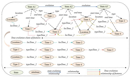 Figure 4 shows the created feature situation layer, and its four state feature evolution chains. Both states A1 and A2 share the same type 1 characteristic. State A1 has start and end times of time 1 and time 2, respectively. State A2 has start and end times of time 2 and time 3, respectively. Thus, constructing the type 1 time evolution chain <type 1, typeTime 1, time 1, typeTime 1, time 2, typeTime 1, time 3> can help characterize type 1 existence stage in the state A1 and state A2 lifecycles. The lifecycle of type1 is represented by time nodes located in the time evolution chain of type1. This method uses temporal information to globally express and analyze how a feature changes over time, aiding the understanding of its dynamic evolution. Additionally, they allow rapid extraction and analysis of the time evolution chain and feature evolution. This is for certain time points or time ranges.