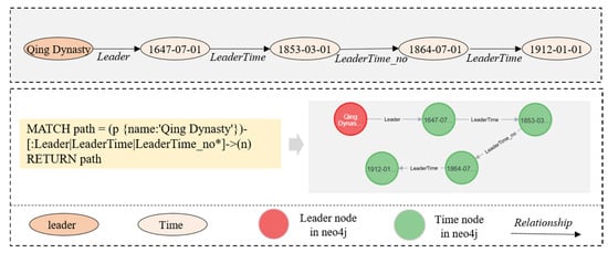 For example, as illustrated in Figure 5, the NJPPA was governed by the Qing Dynasty during two distinct periods: from July 1647 to March 1853, and from July 1864 to January 1912. This temporal evolution of leader is effectively represented through a time-based relational graph. By executing relationship queries such as the one shown (MATCH path = (p {name:‘Qing Dynasty’})-[:Leader|LeaderTime|LeaderTime_no*]->(n) RETURN path), the dynamic changes in the leader attribute over time can be retrieved and visualized, thereby clearly demonstrating the historical succession and interruptions in governance.
