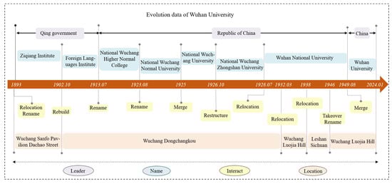 The evolution data for WHU was primarily sourced from the WHU History Museum website (http://xsg.whu.edu.cn/, accessed on 27 June 2025) and the official Wuhan University introduction (https://www.whu.edu.cn/xxgk/bnxs.htm, accessed on 27 June 2025). Based on structured data from websites and historical documents, we extracted key entities and relationships to construct an evolutionary knowledge graph of Wuhan University centered on spatiotemporal entities and their attributes of name, location, and leadership. Figure 6 displays WHU’s evolution data from 1893 to 2024, reflecting its dynamic changes and the complexity of spatiotemporal evolution.