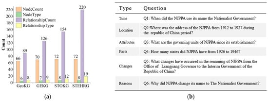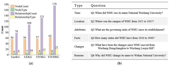 (a) Node and edge statistics for four models in WHU case. (b) Six question types regarding the WHU evolutionary process.