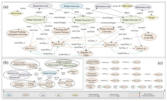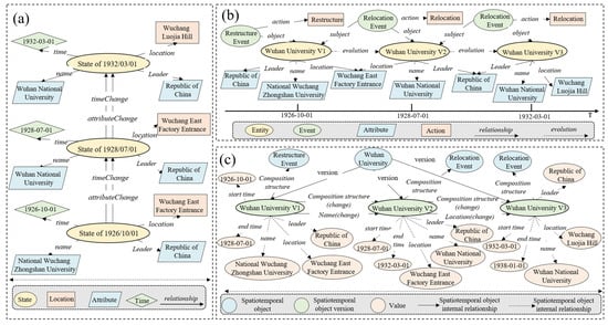 (1) The geospatial–temporal process refers to the long-term evolution of geographic entities and their associated events. Existing models enhance spatiotemporal representation by improving the characterization of temporal progression and enriching the related elements of events within this process. However, the relationships between events and entities are complex, involving diverse interaction patterns and causal links. Current models’ event representations fail to fully capture the effects events have on entities. For example, in the case of Wuhan University’s relocation, the change in address reflects the impact of the relocation event on entity attributes. Yet, when querying the “relocation event” based on the GEKG model, only the involved entities and event timing are retrievable, without information about how the event affected the entity’s specific attributes. This highlights that existing models still require improvement in representing the complex evolutionary processes of spatiotemporal entities.