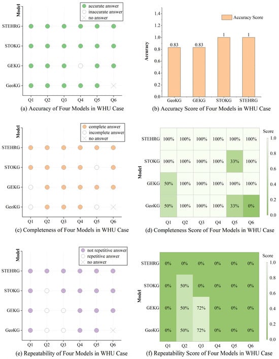 Experiment C posed questions from six perspectives: time, location, attributes, facts, changes, and reasons, as illustrated in Figure 16b. Graphical retrieval for each question was conducted using Cypher in the Neo4j database to compare the spatiotemporal expression capabilities of the four models, with results presented in Table 4. Based on these findings, we analyzed the accuracy, completeness, and repeatability of the GeoKG, GEKG, STOKG, and the STEHRG models, with accuracy shown in Figure 17a,b, completeness in Figure 17c,d, and repeatability in Figure 17e,f.