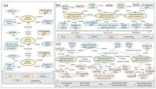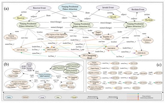 Four graph models, GeoKG, GEKG, STOKG, and STEHRG, were created using NJPPA data from 1368 to 2024, with node and edge statistics in Figure 12a. We selected data from 1927 to 1949 to illustrate the models. Figure 13b presents the spatiotemporal ontology layer of the STEHRG, while Figure 13a depicts its spatiotemporal process evolution, and Figure 13c presents the feature situation layers, where the feature time evolution chain is embedded. Figure 14a, Figure 14b, and Figure 14c display NJPPA evolutionary process models for GeoKG, GEKG, and STOKG, respectively.