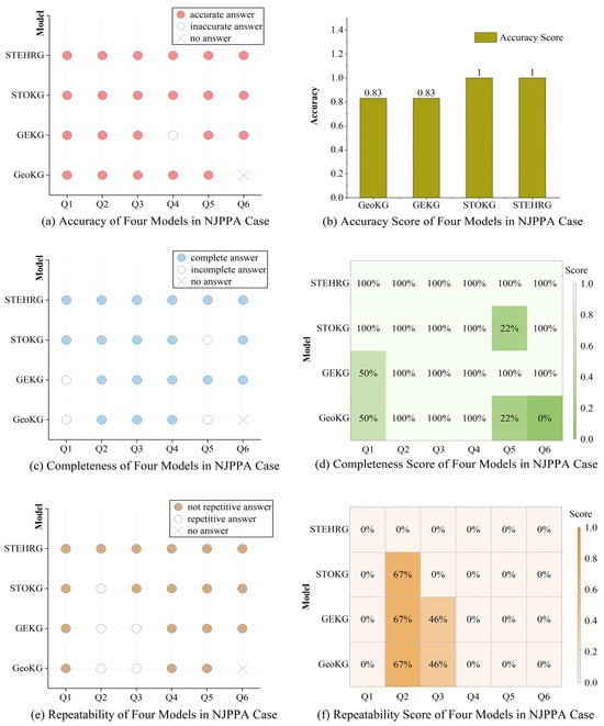 Comparisons of GeoKG, GEKG, STOKG and the STEHRG in terms of accuracy, completeness and repeatability in NJPPA case. (a) Accuracy; (b) accuracy score; (c) completeness; (d) completeness score; (e) repeatability; (f) repeatability score.