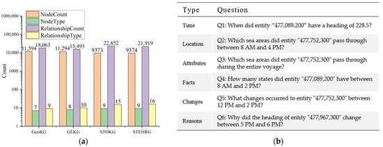 Based on the above experimental data, this paper constructs several geographic knowledge graph models, including existing models such as YAGO, GeoKG, and GEKG, as well as STEHRG. Figure 16a displays statistical information for their nodes and edges.