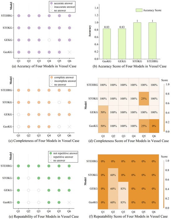 Comparisons of GeoKG, GEKG, STOKG and the STEHRG in terms of accuracy, completeness and repeatability in Vessel case. (a) Accuracy; (b) accuracy score; (c) completeness; (d) completeness score; (e) repeatability; (f) repeatability score.
