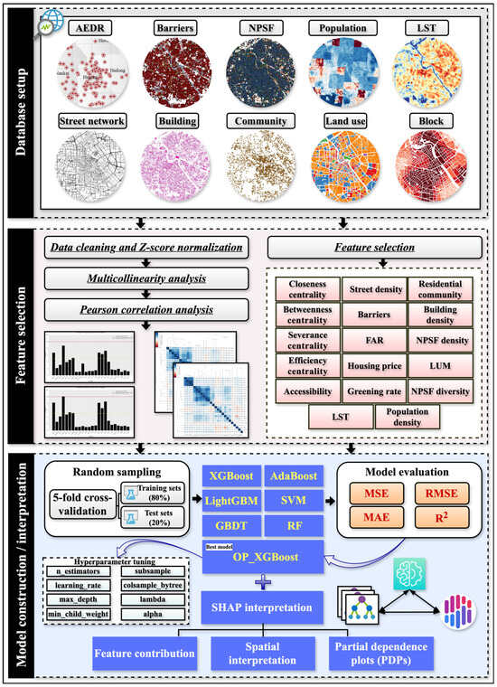 Our study develops an analytical framework to explore the non-linear BE–AEDR spatial nexus in Tianjin Downtown, China (Figure 2). The framework comprises three main phases. (P1) The first phase is related to database setup and preprocessing, including AEDR and BE feature data collection, screening, calculation, and transformation into spatial layers to ensure the elimination of redundancy. (P2) The second phase is related to BE feature selection. Specifically, the potential indicators were identified via extensive literature review, multicollinearity, and Pearson correlation analysis, ensuring the robustness of model input. (P3) The third phase constructs and evaluates the AEDR prediction models. Then, model training, hyper-parameter tuning, and validation were performed step by step. In this study, all procedures run in ArcGIS 10.8 (with a projected coordinate system: WGS_1984_UTM_Zone_50N) and Python 3.9. Finally, we identified limitations of this study and proposed recommendations for AEDR development. To the best of our knowledge, this is the first study to have conducted such a refined analysis of this nature.