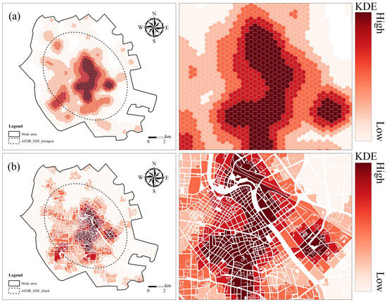 The AEDR intensity at the grid and block scale in Tianjin Downtown were presented in Figure 3a,b. From the spatial distribution perspective, the results revealed a clear center-edge spatial structure, with a significantly higher intensity in the urban core than in the peripheral areas, particularly with high-intensity clusters in Heping, Nankai, and Hexi districts, and low-intensity clusters in Hongqiao, Hebei, and Hedong districts.