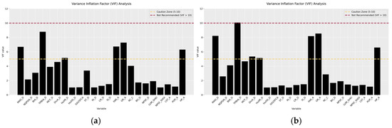 The multicollinearity among 33 independent variables was assessed through VIF, excluding 10 variables with VIF > 10 values, to ensure the model’s reliability. Consequently, 23 variables were retained for analysis (Figure 4a,b).
