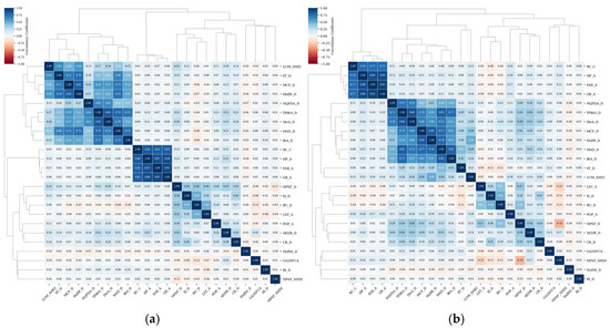 Correlation matrix among the selected features in Scenario I (a) and Scenario II (b).