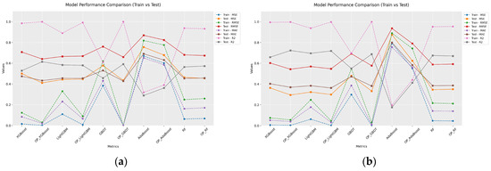 Figure 6a,b shows the scatter plots of the models’ performance predicted on the train and test sets at the grid (SI) and block scales (SII). The performance results of the 10 models (XGBoost, OP_XGBoost, LightGBM, OP_LightGBM, GBDT, OP_GBDT, AdaBoost, OP_ AdaBoost, RF, OP_RF) were evaluated via MSE, RMSE, MAE, and R2 (Table A3 and Table A4).