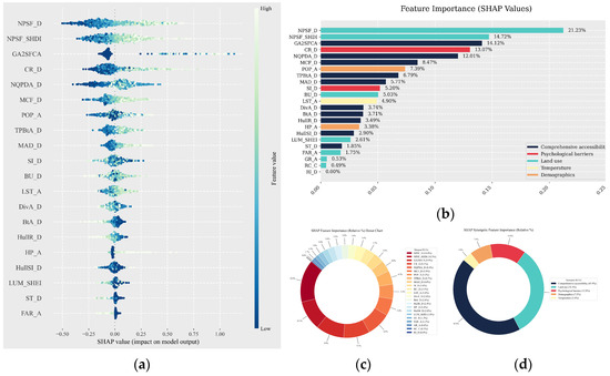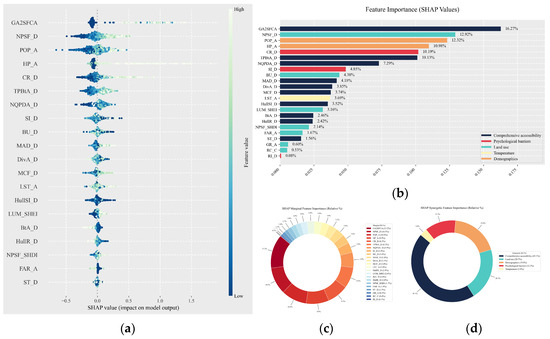 In terms of the synergistic contribution (Figure 7d and Figure 8d), the BE-RI displayed a relatively congruent contribution with a slight difference. The synergistic contribution rate of the comprehensive accessibility indicators stood at 45.1% and 43.9% in the SI and SII models, respectively. In contrast, the land-use indicators showed a higher contribution, standing at 20.7% and 32.4% in the SI and SII models, respectively, whereas the demographic indicators, with 19.0% and 7.5% in the SI and SII, showed adaptivity lower contributions. Additionally, the psychological barrier indicators demonstrated 12.3% and 12.8% and the land surface temperature indicators 3% and 3.4% in the SI and SII models, respectively. The findings revealed that comprehensive accessibility and land use play a significant role, ranking first and second in both SI and SII, underscoring the significance of the top BE features in influencing AEDR.