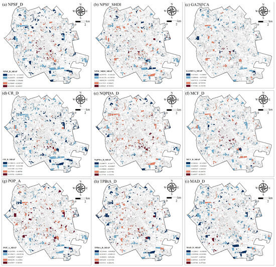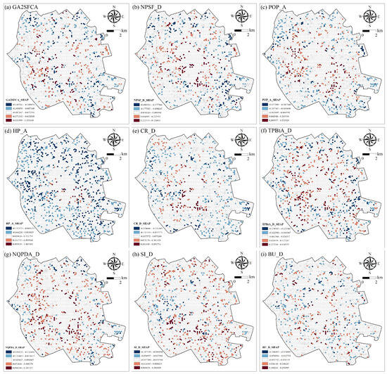The study calculated and analyzed the average SHAP values for each grid cell and block in Tianjin Downtown. Figure 9 and Figure 10 illustrate the spatial distribution of SHAP values for the primary nine key BE features, highlighting the nuances of spatial patterns and reflecting spatial heterogeneity and spatial consistency trends, ultimately enhancing the underserved peripheral zones.