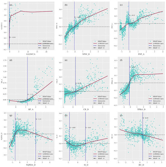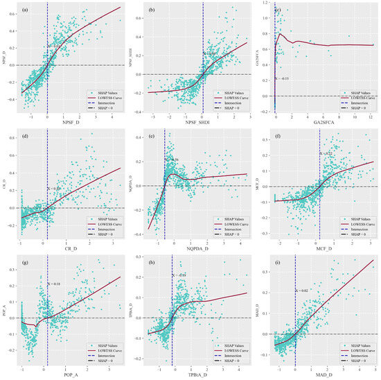 To capture the inherent complexities of the feature dependence and non-linear effects of the primary nine BE features, the SHAP scatter plot and PDPs were utilized. The scatter plots indicated the degree of positive/negative features’ influence on the AEDR intensity, while the fitted LOWESS curve revealed the threshold effects across grid and block patterns, as shown in Figure 11 and Figure 12.