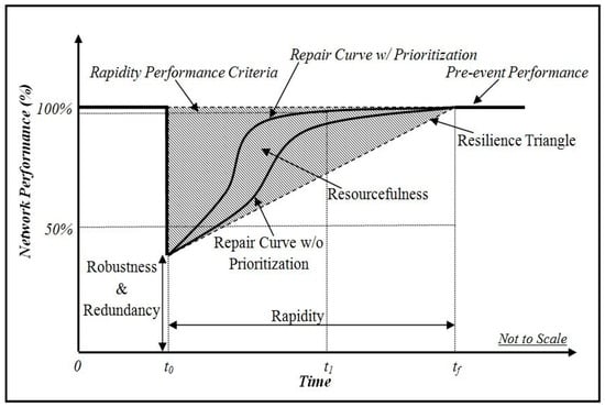 Assessing system resilience and identifying vulnerabilities are essential steps for effective risk mitigation [19,20]. In general terms, resilience is the capability of a system to cope, absorb, and withstand the effect of a random attack and then survive and recover immediately afterward [19,21]. Figure 1 depicts the different resilience phases and their impact on network performance. The resilience process involves four stages: anticipation, absorption, adaptation, and recovery. Anticipation involves forecasting and planning for possible system failures. Absorption consists of reducing the impact of an event on the system through robustness and redundancy. The initial system percentage drop in functionality at time t0 is based on these two interlinked aspects without differentiation. Adaptation involves resource allocation to restore functionality immediately after the event [22]. Finally, recovery consists of returning the system to an acceptable performance level at a time tf according to predetermined standards. The final state of the system after recovery depends on the extent of repairs and improvements [23]. The area between the curves indicates the system’s ability to adapt and recover from disruptions. The importance of prioritization is highlighted by the difference in performance levels between a prioritized and a non-prioritized recovery process at time t1, which is linked to the speed of performance criteria.
