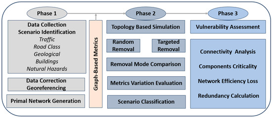 This section presents the proposed approach to evaluating the vulnerability of urban transportation networks under various simulated disruption scenarios. As illustrated in Figure 2, the methodology unfolds in three primary phases. The first phase involved a comprehensive survey of the study area to collect, update, and georeference relevant data. This included the identification of scenario-specific parameters such as traffic (peak traffic volumes), road class (functional classifications), geological/seismic conditions (soil and rock type-based damage increments), buildings (inventory including height, density, and locality), and natural hazards (exposure to sea-level rise, tsunamis, and river floods). While traffic and road class are line features representing network connectivity and flow, geological conditions, buildings, and natural hazards are polygon features that define spatial zones of impact and exposure. These polygons are essential for translating their effects onto the geometric structure of the transportation network and for assessing vulnerability across its overlaid nodes and links. The main road network and scenario-specific attributes were evaluated for geometric consistency, attribute completeness, and spatial accuracy using OpenStreetMap data, with visualizations conducted through Esri ArcGIS 10.8 and Google Earth platforms. Moreover, GIS was used to generate network datasets and define the entire network as G = (V, E), comprising a set of vertices V = (v1, v2 … vn) and a set of edges E = (e1, e2 … em). This study considered an undirected network, assuming drivers tend to ignore traffic directions in extreme events, particularly in developing contexts. Scenario-specific weights were assigned to network components according to their functional importance and spatial exposure; for instance, major roads providing access to hospitals and links located within hazard zones were given higher weights to reflect their criticality and vulnerability.