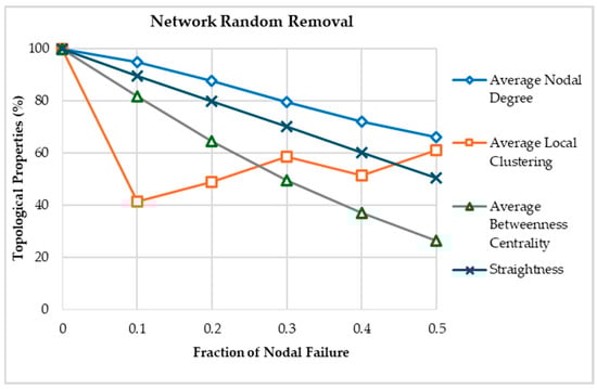 Topology-based simulation using a random removal technique was applied to assess graph theory topological and performance metrics (Figure 3). The average nodal degree, which describes the global connectivity of the system, decreased dramatically, highlighting the system’s high dependence on the state of individual nodes. To assess the accessibility of alternative routes, local clustering coefficients were employed to depict the local redundancy of the system. After randomly removing 10% of the nodal network, a sharp decline in local redundancy was evident. This reflects the importance of nodal connectivity, where highly connected nodes can induce significant impacts. Following this decline, the formation of isolated groups led to a localized increase in the clustering coefficient, as smaller interconnected clusters emerged within the fragmented network. Moreover, declines in betweenness centrality and straightness degree can degrade network performance, leading to substantial delays, detours, or cancelation of trips after relatively small nodal disruptions. In parallel, trends in connectivity indices and density measures indicate reduced network efficiency, with nearly half of the network’s functionality lost after just 30% of nodes were disrupted (Figure 4; see also [58]).