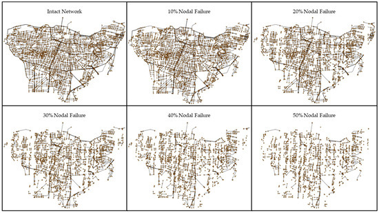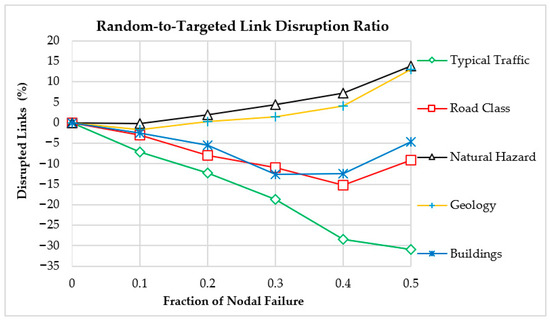 The study evaluates critical network nodes and their redundancies to analyze the system’s performance under different removal modes. Figure 8 illustrates the extent of disrupted links resulting from both random and targeted removal modes. The simulation results of both undisturbed and disturbed components highlighted that network performance was primarily influenced by traffic, road classification, and buildings scenarios. The comparison was based on disrupted links in the random failure removal mode over those in the targeted failure removal mode. The analysis of network traffic scenarios revealed that targeted events could result in over a 30% increase in failed links compared to random events. In road class and building scenarios, the decline persisted until the fourth removal. After that, the trend deviated, indicating the deterioration of the most highly connected intersections; however, the ratios remained lower than those in the random failure mode. Conversely, the remaining two scenarios indicated an increase in disrupted links in the random failure mode compared to the targeted one. This suggests that the weighted geology and natural hazard scenarios were not closely associated with the most connected nodes and links in the network.