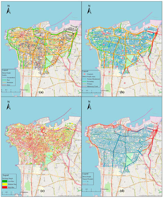 Beirut transportation network weighted scenarios: (a) typical Monday noon peak traffic; (b) roads class and main hospitals; (c) building height distribution; and (d) vulnerable links to natural hazards.
