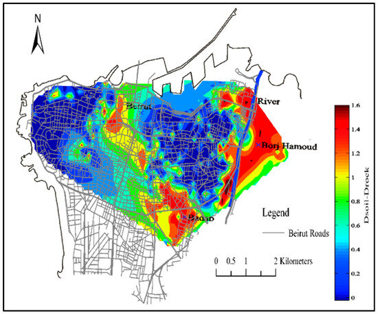 A damage increment map was used to evaluate the seismic vulnerability of soil and structure data [53]. The map was based on a neural network approach that considers three typology classes: frequency ratio between soil and structure, PGA for various seismic scenarios, and horizontal-to-vertical spectral ratio interpolation, which is commonly used in seismic vulnerability and risk assessment. The parameter Dsoil–Drock represents the difference in expected structural damage between soft soil and rock under identical seismic loading. Higher values depicted in red indicate stronger amplification and thus greater damage potential (Figure 6). Links and nodes located within high-amplification zones were assigned higher weights to reflect increased vulnerability in the network analysis. Correspondingly, maps created for PGA equal to 0.25 indicated a significant damage increment for low-rise buildings (1–3 floors with an average height of 3 m each), as reported in [53,59]. The damage increment map was combined with the Beirut transportation network, along with 18,400 buildings represented by the height of their structure. Buildings were divided into three categories, where 27% of total buildings in Beirut were low-rise (i.e., 1–3 floors), 31% were medium-rise (i.e., 4–7 floors), and 42% were high-rise (i.e., >7 floors). It was considered that the low-rise buildings were the most vulnerable to seismic events as most of these structures were built before 1950 (i.e., masonry class) or between 1975 and 1990 during the civil war period, where a lack of quality control, construction, and reconstruction of structures was prevalent.
