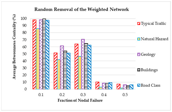 The topological parameters of the weighted network were interpreted through random nodal removal after each removal fraction. The average nodal degree, straightness, and connectivity indices of all weighted scenarios showed a significant downward trend. The most noteworthy trend was the average betweenness centrality, which decreased significantly for all cases after the second random removal, as shown in Figure 7. However, nodes in the degraded network were rearranged to form newly separated clusters, as reflected by the slight increase observed in the bar chart at the third removal iteration. Overall, the substantial decrease in the topological parameter indicates a network structure failure that can lead to severe resource scarcity and hinder emergency teams. Moreover, the network exhibited a low average path length, suggesting structural characteristics similar to both random and small-world networks. In such topologies, the impact of node removal—whether random or targeted—tends to be more evenly distributed across the system [60]. This stands in contrast to scale-free networks, which, while highly resilient to random failures, are disproportionately vulnerable to targeted attacks on high-degree hubs [61]. In random networks, where most node degrees are concentrated around the average degree, the structure is practical but remains susceptible to random disruptions. Similarly, in the case of the Beirut network, system efficiency tends to decline under repeated random node removals, particularly when structurally significant nodes are impacted.