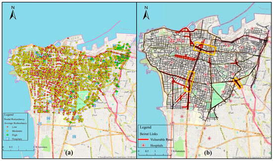 Network resilience and critical components: (a) nodal average redundancy of Beirut intersections to the accessible hospitals and (b) major vulnerable links and intersections.