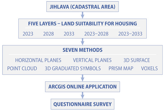 The main research questions of the study focused on the design and subsequent evaluation of 3D geovisualization of land suitability. For this purpose, seven different methods of 3D visualization were selected and applied to housing suitability data within one of the cadastral areas of the city of Jihlava. The resulting visualizations were published through an interactive ArcGIS Online web-based map application, available at https://experience.arcgis.com/experience/2f05485ccaaf4d56ad7690bbc5db3864 (accessed on 6 July 2025). The Esri solution (ArcGIS Online) was chosen because respondents are used to viewing land suitability data using this technology. Following the creation of the visualizations, a questionnaire survey was conducted to assess the usability and comprehensibility of the various forms of 3D geovisualization of land suitability. The methodology of the study is graphically illustrated in Figure 1.