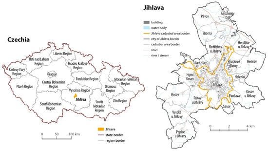 Jihlava is located in the central part of the Czech Republic, at the historical border between Moravia and Bohemia (Figure 2). It serves as a key regional center and an important transportation hub. The city covers an area of 87.87 km2 and has a population of 53,986 [43]. The selected cadastral area of Jihlava, designated as the study area, spans 13 km2 and is home to nearly 40,000 residents.