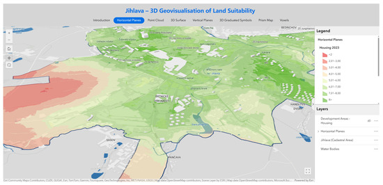 A 3D surface is a continuous visualization method usually created by interpolating points from a point cloud. Unlike horizontal planes, each cell does not have a constant Z coordinate, but the height of the cells is variable depending on the value of the phenomenon. In the case of this article, the height of the cell corresponds to the land suitability value. The values are, thus, expressed by two graphical variables—color and height (red color and low elevation means low values, green color and high elevation means high values). For the 3D surface, a 30-times elevation (z-factor = 30) was used to better highlight differences in land suitability. For this method, only one layer was visualized (Housing 2023). Due to the technical design of the 3D surface, five separate scenes would need to be created as the 3D scene in ArcGIS Online only allows for one elevation surface. Therefore, the application would have to contain five pages for the different layers displayed by the 3D surface method, which would worsen the user experience.