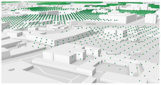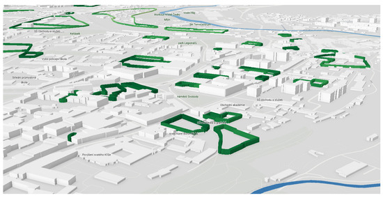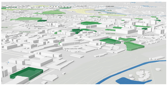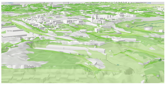 The use of 3D geovisualizations in urban space and planning is becoming increasingly common, providing a more realistic perspective on spatial problem solving. Three-dimensional city models, which visualize not only buildings but also engineering networks, public infrastructure, and environmental elements, have become valuable decision-making tools. In such environments, advanced 3D analyses can be conducted, yielding new insights necessary for efficient planning and development. The potential applications of 3D urban visualizations in spatial planning were examined in a study by Miranda et al. [35], while the current trend of integrating virtual reality with 3D modeling to enhance spatial planning was addressed by Cao and Chen [36]. The use of 3D methods in Czech urban planning is explored by Rucký and Janečka [37], who state that, unlike traditional 2D visualization methods, 3D elements allow for a more perspective-driven view of issues, offering a broader context. This topic is also being applied in practice; 3D city visualizations are used by institutions such as The Prague Institute of Planning and Development [38] and the city of Brno [39]. On a global scale, 3D visualizations in urban planning are increasingly explored in professional research, with growing implementation within information systems and spatial analyses for planning purposes. Billen et al. [40] provided a summary of the experiences with the use of 3D city models, identifying key challenges that will need to be addressed. They note that 3D city models, enriched with data and integrated into information systems, can serve as a robust platform to support sustainable development and more efficient urban management. The integration of 3D models in urban planning was also examined by Sun et al. [41], who focused on their use within BIM and GIS for 3D cadastral purposes. An additional benefit for 3D geovisualization comes from freely available data, such as that from OpenStreetMap (OSM) and the Shuttle Radar Topography Mission (SRTM). These data have applications not only in land-use planning but also extend into transportation, ecology, and culture [42].