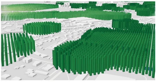 Horizontal Planes are a way of displaying continuous spatial data where the entire dataset has a constant elevation (Z) coordinate and differs only in the way it is displayed, such as the color of the cell [49]. This is the simplest method and the only one that shows the original land suitability data in the case of this article. The other methods require adjustments to the data using different tools. The elevation was set to 5 m above the surface. The transparency was set to 50% to make the buildings and basemap visible.