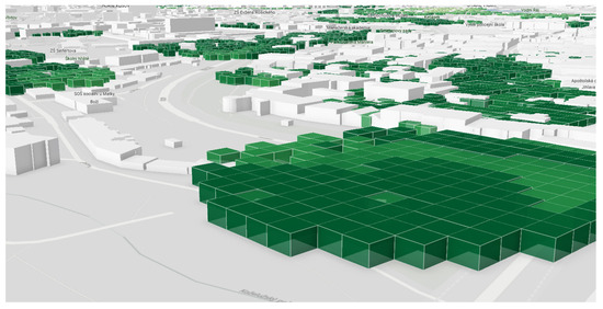 In Voxel-based geovisualization, data is represented by blocks with different heights depending on their values. It, therefore, has common elements with the 3D graduated symbols and prism map. However, in contrast to 3D graduated symbols, in the case of voxels the adjacent blocks (columns) are connected to each other, and unlike prism map, all polygons have a constant size [28]. The voxels represent values in a similar way to the Prism Map (the more extruded the polygon and the darker the color, the higher the value). However, unlike Prism Map, a regular continuous square grid with a cell area of 50 square meters is used. The transparency was set to 50% to make the buildings and basemap visible.