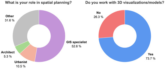 A questionnaire survey was then conducted with experts in urban planning and GIS from local governments of selected cities in Czechia and Slovakia who have experience with the Urban Planner methodology. To objectively evaluate 3D geovisualization of land suitability using different methods, a questionnaire survey was chosen. The survey was targeted at experts of municipal authorities of selected cities in Czechia and Slovakia who are involved in urban planning and GIS. In these cities, land suitability analysis using Urban Planner methodology has been carried out previously, so the respondents are familiar with this data. The questionnaire was created using ArcGIS Survey123 and is in Czech as it is aimed at Czech and Slovak respondents. The respondents were selected professionals from the field of spatial planning and GIS who have already encountered land suitability maps.