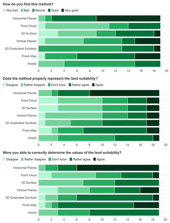 Users best determined land suitability values using the Horizontal Planes method. The Prism Map, 3D Graduated Symbols and Voxels methods also achieved good results. In the case of Point Cloud, 3D Surface, and Vertical Planes, neutral or negative responses prevailed.