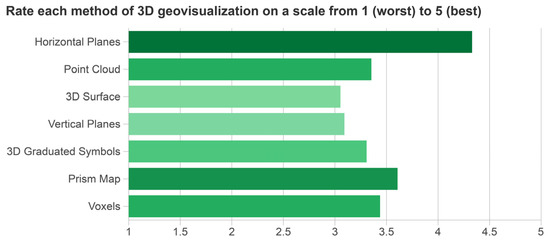 In the overall evaluation, the respondents chose the Horizontal Planes method as the best, which most closely resembles classic 2D visualizations. Other well-rated methods were Prism Map, Voxels, and Point Cloud. On the other hand, 3D Surface and Vertical Planes were voted as the worst by users. However, no method had an average rating of less than 3 points (Figure 15).