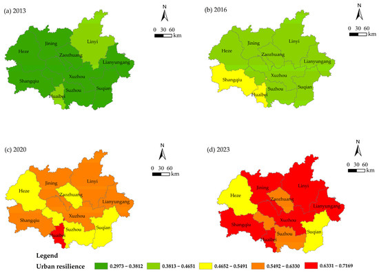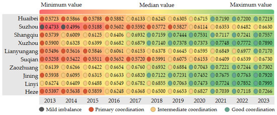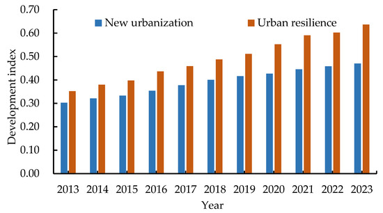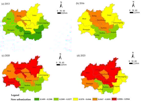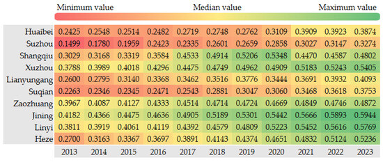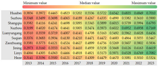 - The development indices of new urbanization construction and urban resilience development. In terms of time series evolution, the new urbanization and urban resilience in the HEZ showed a steady upward trend from 2013 to 2023, and the growth rate of urban resilience was slightly higher than that of new urbanization. During the study period, the new urbanization construction index ranged between 0.30 and 0.47, the development level was relatively low, and there was still further improvement. The urban resilience development index ranged between 0.35 and 0.64, with the initial achievements in development. In terms of spatial evolution, the new urbanization generally presents the spatial characteristics of a “north–high, south–low” spatial pattern, and the distribution of urban resilience develops from regional distribution to regional overall improvement. Core cities like Xuzhou, Linyi, and Jining exhibited high levels of new urbanization construction and urban resilience development, with diminishing gradients toward peripheral areas, particularly weak in southern marginal cities.
