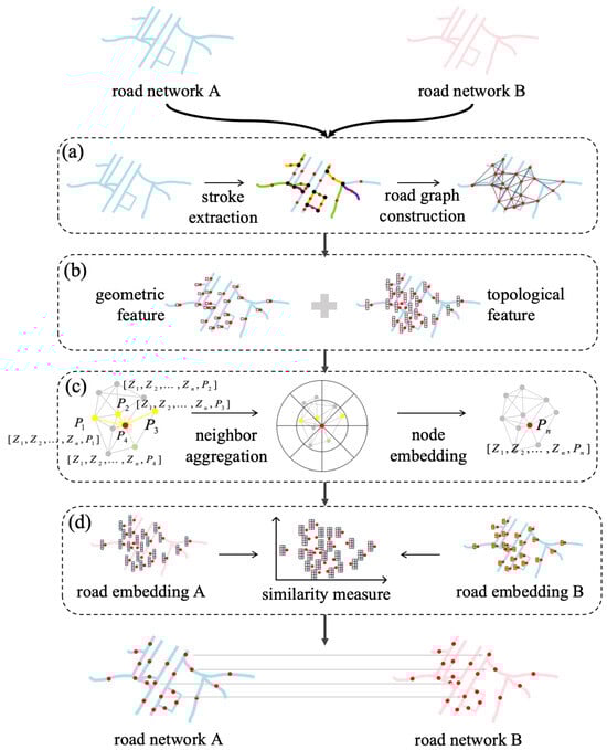 Traditional road-network matching methods fall into three categories, namely geometry-based, semantic-based, and advanced algorithms. Geometric matching algorithms achieve road-network matching by comparing the distance, shape and topological similarity of road segments [3,4]. Semantic matching algorithms, on the other hand, focus on analyzing the similarity of semantic attributes of road networks [5,6]. Advanced matching algorithms, such as ICP [7], BG [8] and limited stroke algorithm [9], improve the matching accuracy by integrating the geometric and topological information of roads and optimization strategies. However, these methods are still constrained by factors such as road network complexity [10,11]. Chen et al. [12] propose a method that integrates semantic, geometric and topological information, achieving good experimental results while requiring high data integrity. The road-network matching algorithm using fuzzy hierarchy theory requires precise road classification, and the matching accuracy decreases when semantic information is missing [13]. In conclusion, traditional road-network matching algorithms rely on manually extracted features for similarity measures and are limited by prior knowledge of parameter selection and the need for high-quality data, which means their performance struggles when dealing with dense and irregular road network structures. Recent road-network matching methods have evolved towards integrating local and global features, and have not been able to effectively overcome the above problems, despite the development of more advanced similarity measures [14,15].