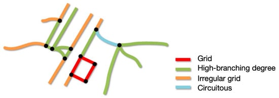 - Wang, M.; Ai, T.; Yan, X.; Xiao, Y. Graph convolutional network model for recognizing road orthogonal grid patterns. J. Wuhan Univ. (Inf. Sci. Ed.) 2020, 45, 1960–1969. [Google Scholar]