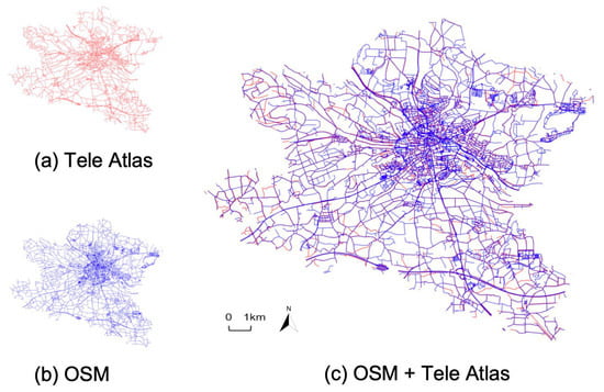 Ansbach’s road network. Road data from (a) Tele Atlas, (b) OSM and (c) data overlay of the two sources.