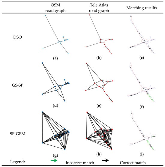 The GS-SP and SP-GEM methods, on the other hand, both exhibit significant limitations in dealing with the case of inconsistent segmentation granularity. The GS-SP uses Hausdorff distance-based modeling to construct spatial-search graphs, and focuses on spatial geometric features in node neighbor modeling. In the sample ring-road network, the constructed graph model resembles a topological graph. As a result, in the lower section of the ring-road sections, the segments that are connected to the ring-road network can be matched correctly, but the rest of the road segments cannot be matched correctly, due to inconsistent node neighbor representations. This is due to varying segmentation granularity, and the graph model is different from the topological graph, which makes its match-success rates decrease, compared to DSO. When faced with one-to-many road segment correspondences, the node neighbor modeling of GS-SP struggles to establish accurate spatial-search graph correspondences, and this limitation directly affects the match metric.