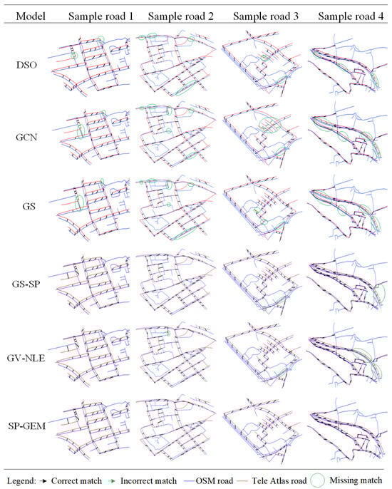 To assess the effectiveness of SP-GEM, we visualize and analyze the road-network matching results. As shown in Figure 6, sample road 1 and sample road 2 contain roads with different degrees of grid structure, and all methods except GS-SP and SP-GEM have matching errors. For sample road 3, there are more intersections in these road segments, and DSO, GCN, and GS also show more mis-matches. Sample road 4 consists mainly of highways, and is characterized by the presence of a large number of parallel road segments. In that case, only SP-GEM achieved zero matching error, while all baseline models failed to discriminate between the parallel roads in sample road 4, for their geometric similarity.