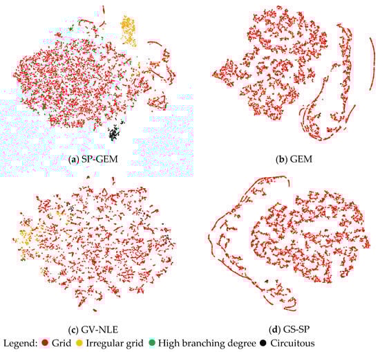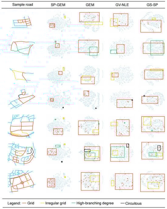 To better understand the role of spatial pattern in road neighborhood aggregation, we selected several sample roads that exhibit diverse road network-pattern structures. We examined the proximity of road neighborhood node embeddings using dimensionality reduction visualization techniques. As illustrated in Figure 8, four types of road network patterns were annotated for each sample road, along with their corresponding distribution ranges in the embedding space. By analyzing the proximity among roads that share the same pattern and assessing the overlap between different patterns, we can gain valuable insights into how spatial-pattern information influences road neighborhood modeling. The SP-GEM embeddings demonstrate a high level of proximity among roads of the same pattern, while clearly separating different pattern types. In contrast, the GEM method can distinguish pattern-specific roads in certain instances, but it generally shows mixed distributions across most samples. Further analysis of GV-NLE and GS-SP reveals that, being methods that do not explicitly incorporate spatial-pattern information, they tend to produce embeddings in which roads of the same pattern are scattered and roads of different patterns are heavily intermingled. In summary, integrating spatial-pattern information significantly enhances the model’s ability to capture contextual differences among roads, thereby improving the cohesion of similar road features and the distinguishability between different road types.