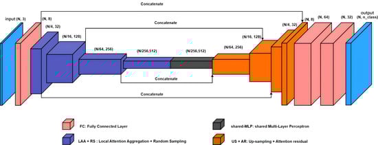 Our network’s design follows an encoder-decoder pattern inspired by U-Net (see Figure 1), but with significant modifications tailored for 3D point cloud processing. While traditional U-Net employs a symmetric encoder–decoder design for 2D image segmentation, our approach integrates LAA (see Figure 2) modules and random sampling in the encoder phase to better handle 3D point cloud sparsity and combines up-sampling with AR (see Figure 3) modules in the decoder phase to dynamically fuse multi-scale features. These modifications address key limitations of U-Net in processing irregular 3D data, as further demonstrated by our quantitative results in Section 4.